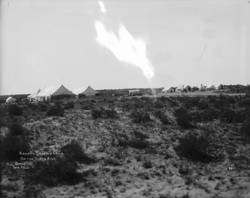 - "Grant's Grading Camp on the North Side;" several large canvas tents, a wood frame building, and machinery among the sage brush
