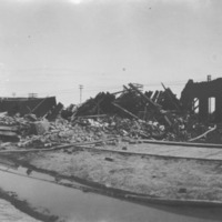 - Panoramic view looking northwest down Main Ave with the remnants of a destroyed building on the right. Other businesses and buildings visible include the Idaho Department Store, Candies.