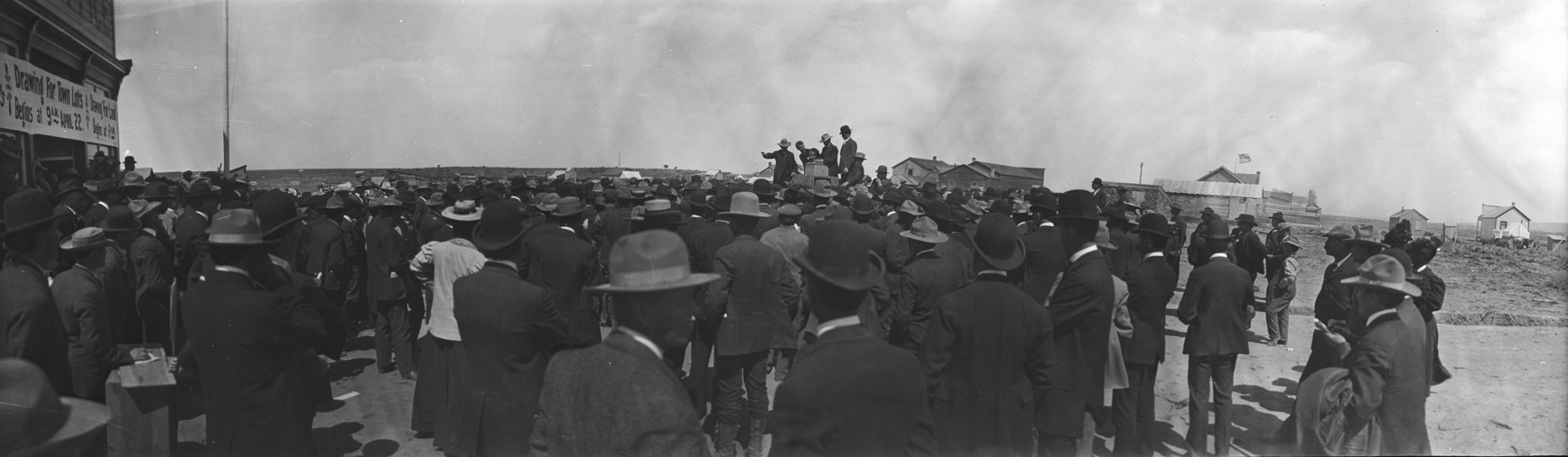 - Panoramic view of a drawing for town lot, with a large crowd of in front of a land office building. In the center of the crowd several people stand on a platform, including a young boy.