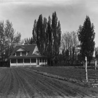 - "A Farm Home, Near Gooding, Idaho;" a white house sits among several trees, with a plowed field in the foreground. A fence lines the property on right.