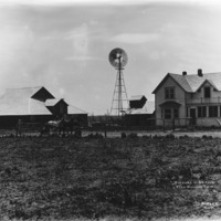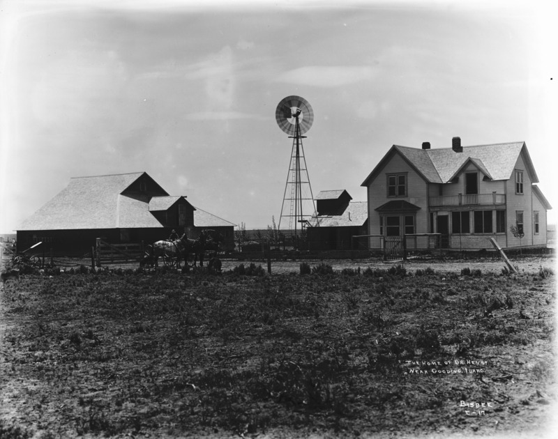 - "The Home of Dr. Henry, near Gooding, Idaho;" View of a two-story farm house, several outbuildings, and a windmill across a field. A man leads a team of horses at left.