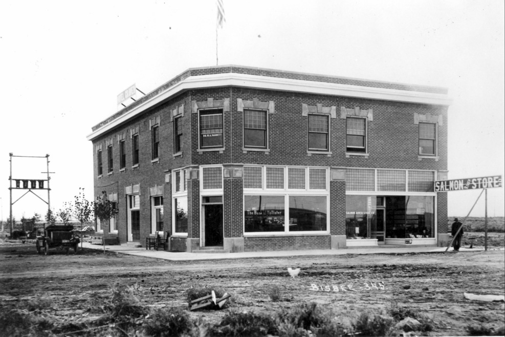 - Two-story brick corner building that houses the Hotel Craven, Bank of Hollister, Dr. W. A. Parrett, and the Salmon River Store Co. A man stands beneath a wooden Salmon River Store, Co. sign at right and an automobile (car) is parked on left. A chicken runs across the area in front of the building.