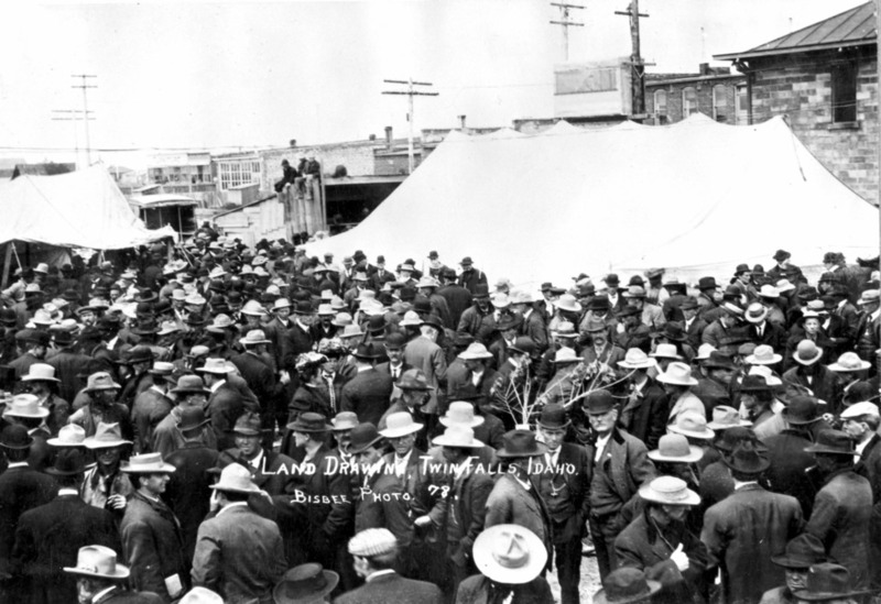 - "Land Drawing, Twin Falls, Idaho;" a large crowd of mostly men stand in front of a canvas tent erected in an alley behind a brick building.