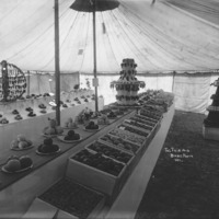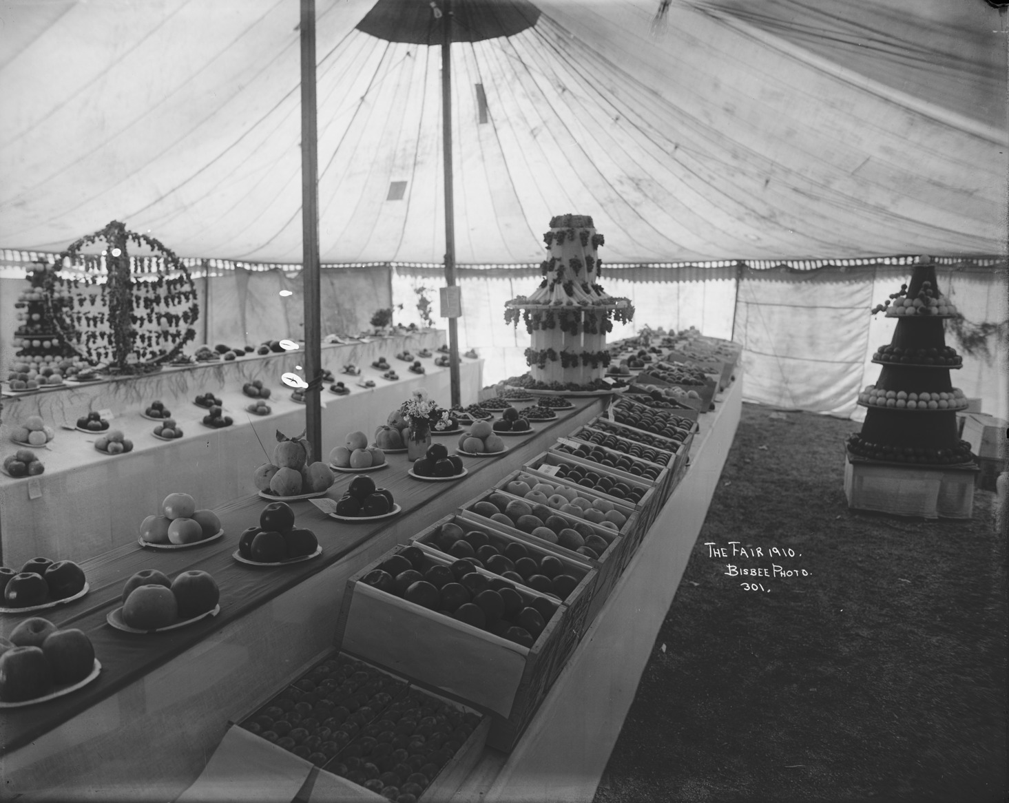 - "The Fair 1910;" Interior view of tent with fruits and vegetables exhibited
