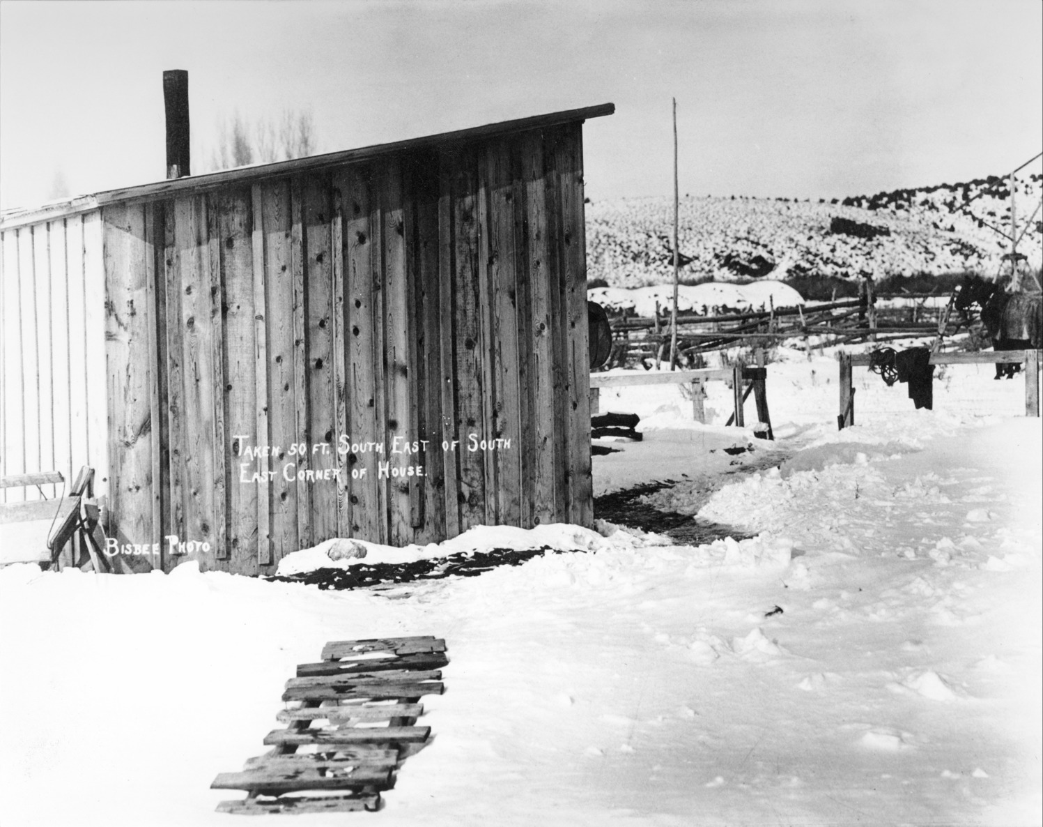 - "Taken 50 Ft South East of South East Corner of House;" an outbuilding in the snow; fencing or corrals are visible in background.