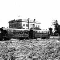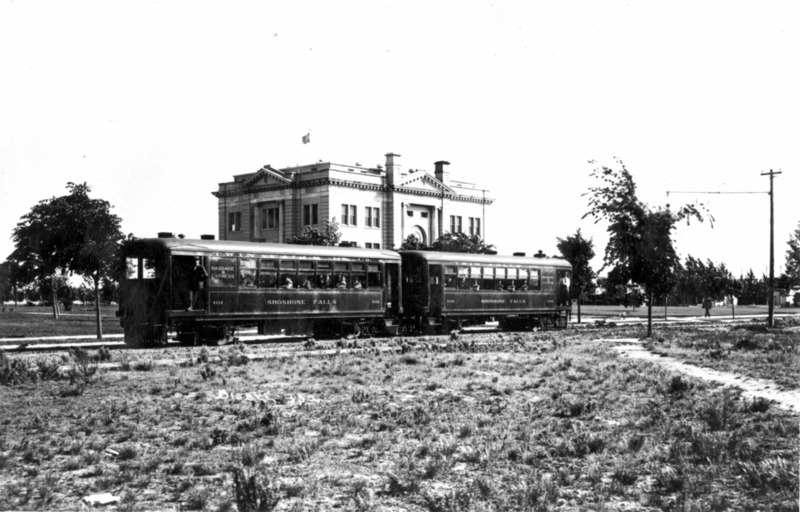 - The Twin Falls Electric Railway cars parked behind the Court House. Several people pose leaning out the windows.
