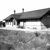 - Railroad station (depot) at Buhl. A water tower and a smaller outbuilding at left; several rail cars on tracks behind station.