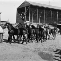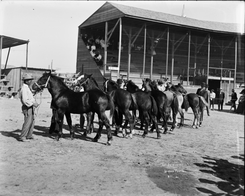 "The Fair 1910;" showing and judging horses, at the Twin Falls Athletic Field, grandstand in the background