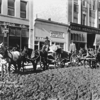 "Byron Averett, Freight Line to Jarbidge;" two teams with freight wagons parked alongside the boardwalk (sidewalk) of Main Ave. Two men drive the wagons, another stands on the boardwalk. Behind them are the Bedford Drug Co, with the W. P. Guthrie Law Office; Baths and the Jarbidge Stage office; the Booth Mercantile Company; and the McCornick Bank (later known as the Twin Falls Bank and Trust.)