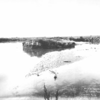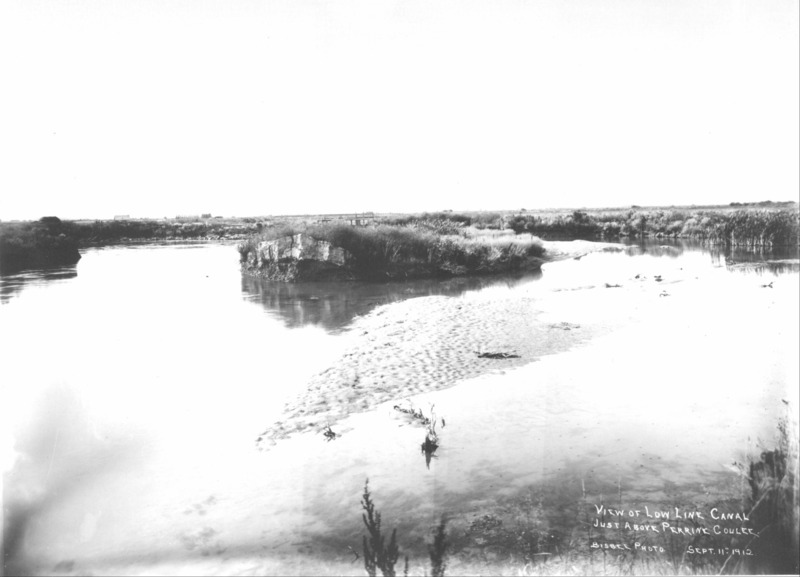 - "View of Low Line Canal Just Above Perrine Coulee; September 11, 1912;" wide view of water in canal, with gates; trees and buildings in background.