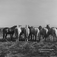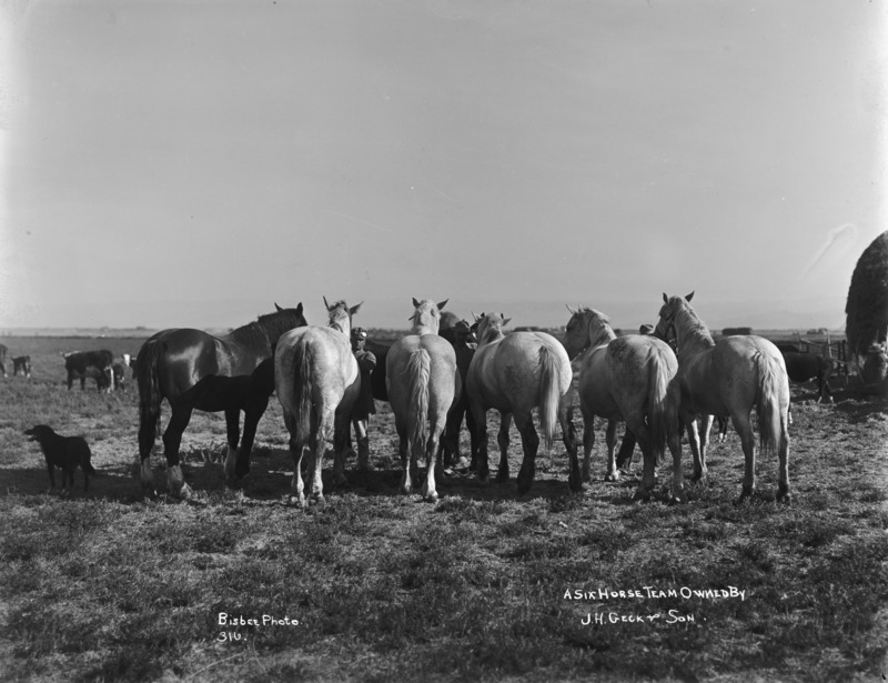 "A Six Horse Team Owned by J.H. Geck & Son;" man in a field with horses, cattle and a dog