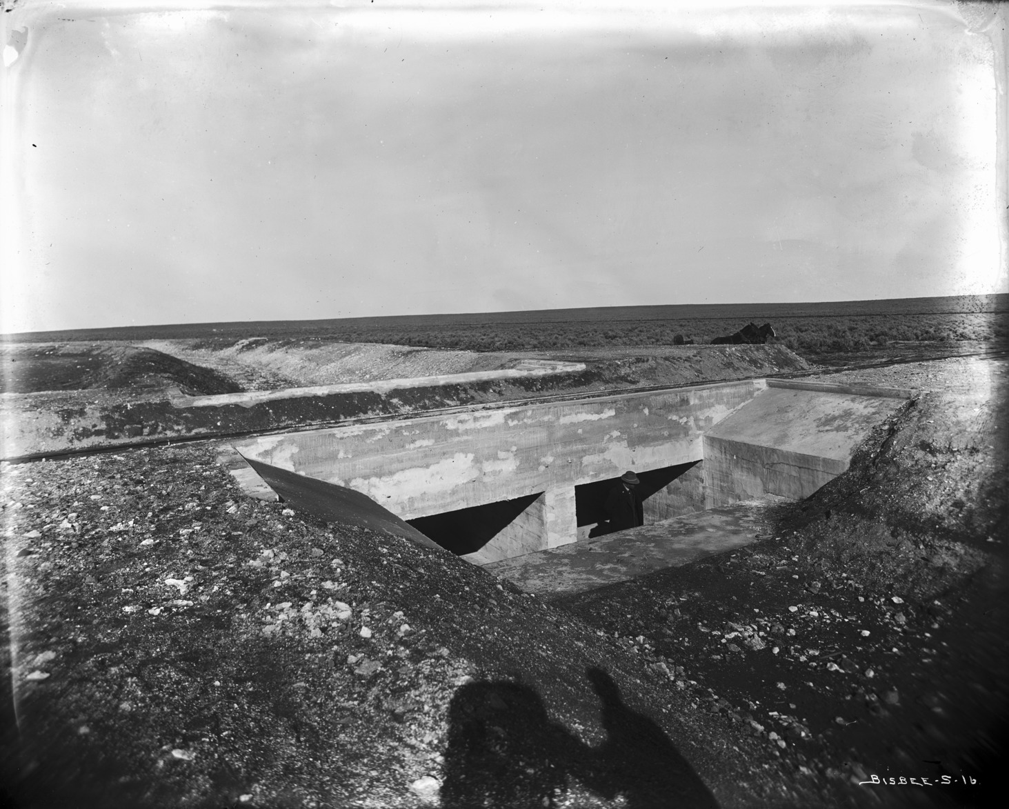 - A canal siphon under a railroad track. A man stands underneath; two horses and a buggy are visible behind the berm.