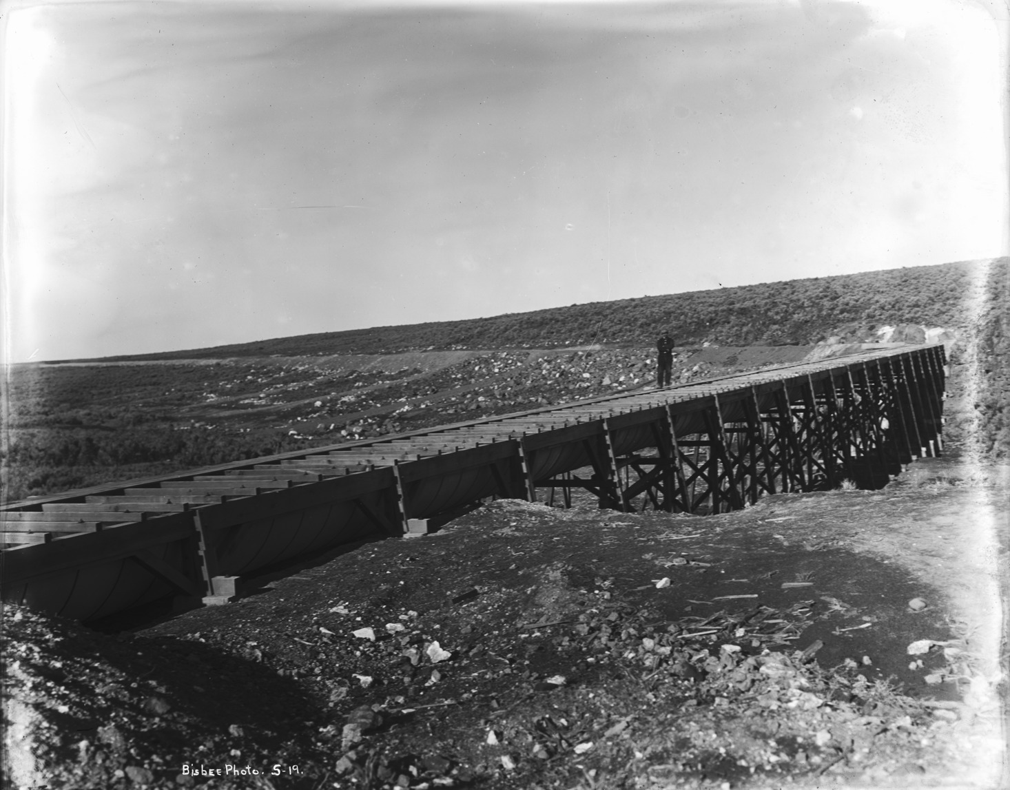 - A man stands atop an elevated canal flume.