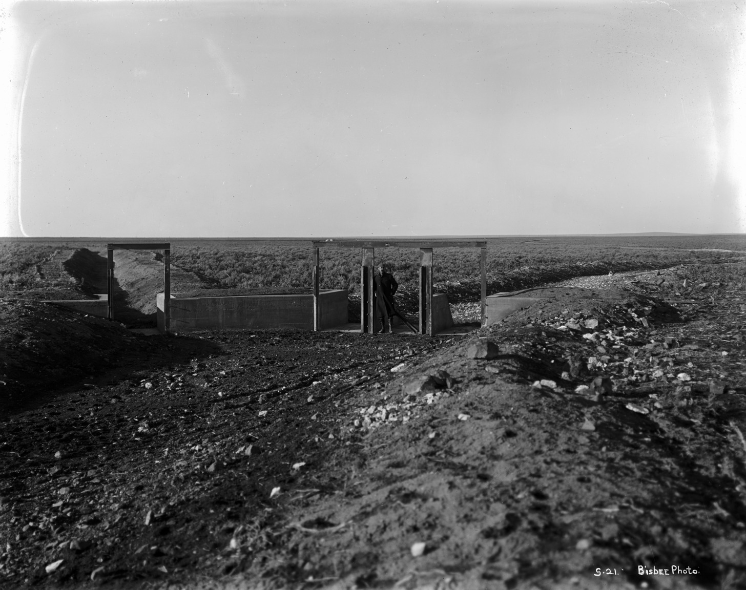 - A man (possibly Clarence Bisbee) stands beneath canal gates under construction.