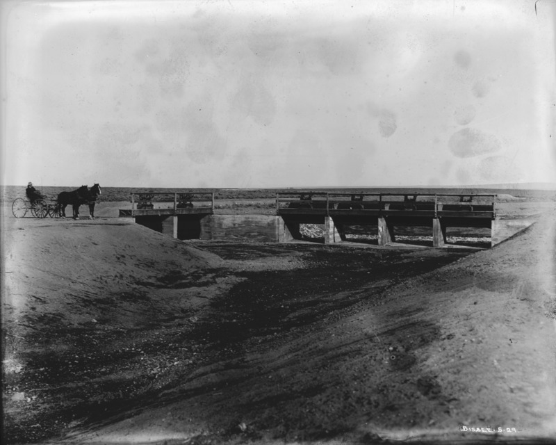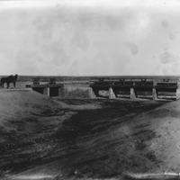 - A man in a two-horse buggy stops on a berm beside canal gates. The canal bed is dry.