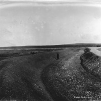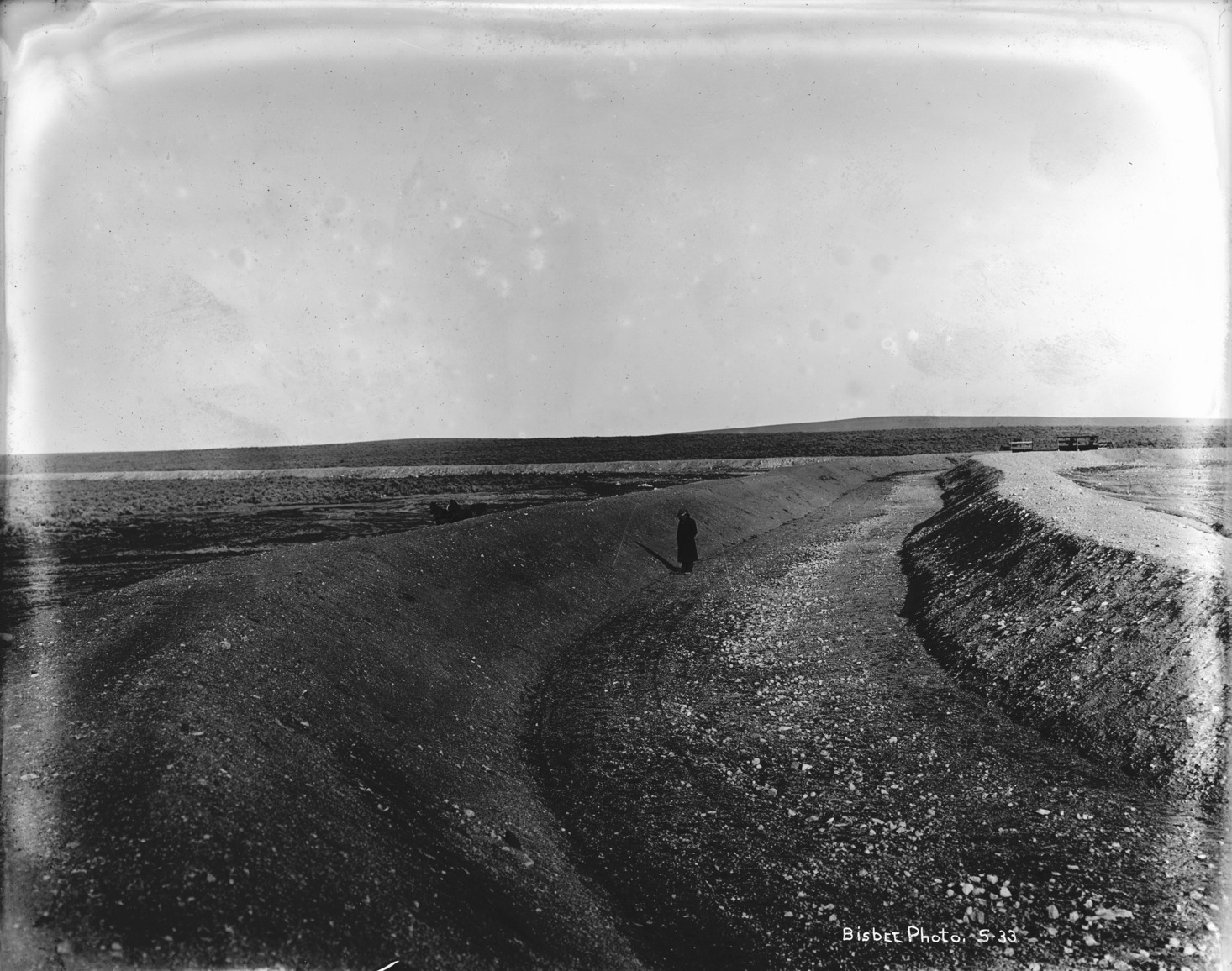 - A man stands at the bottom of a dry canal bed.