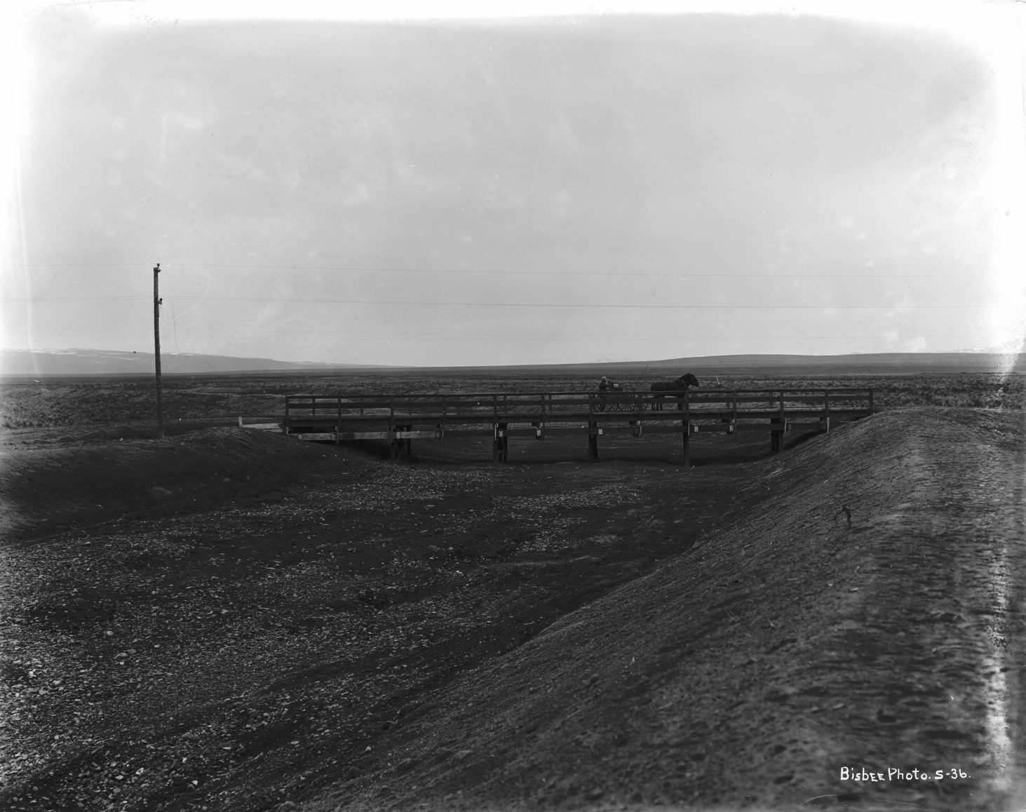 - A man and a two-horse buggy stands on a low bridge over a dry canal.