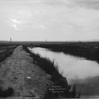 - "Main Canal. Salmon River Tract;" look down a canal and berm toward a bridge; automobile (car) stopped on bridge. House and outbuildings on left background.