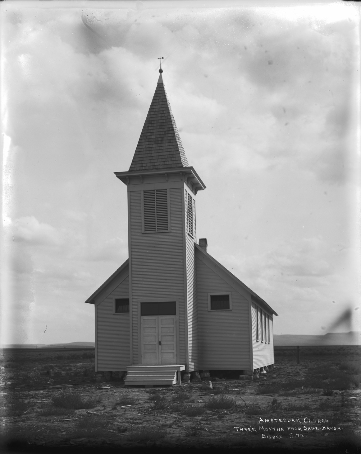 - "Amsterdam Church; three months from Sage Brush;" plain wood church with tall steeple.