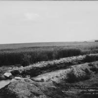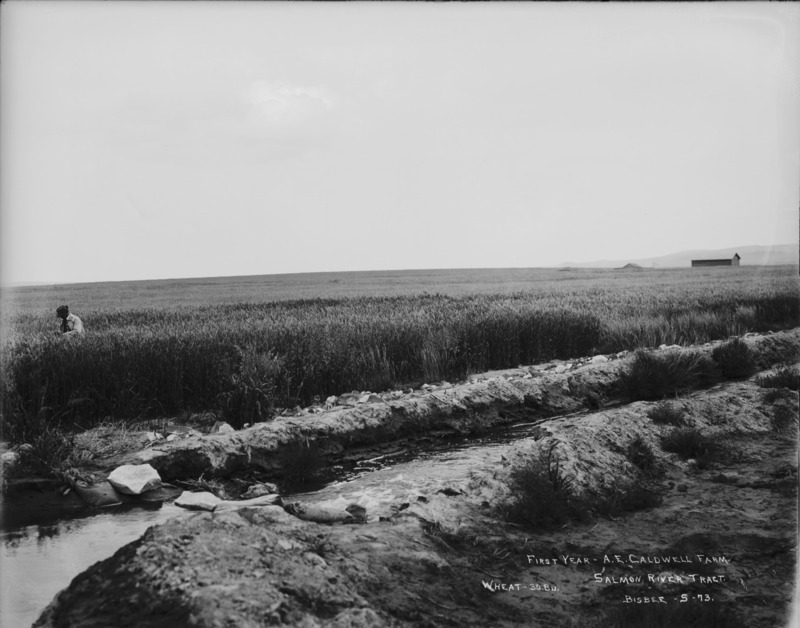 - "First year, A.E. Caldwell Farm. Salmon River Tract. Wheat - 30 bu;" a man stands in a grain field behind irrigation ditches; farm house and barn in background.