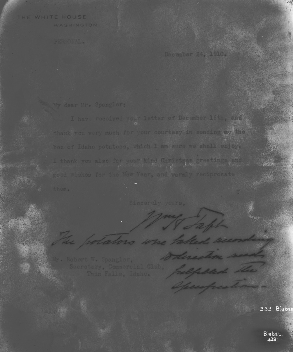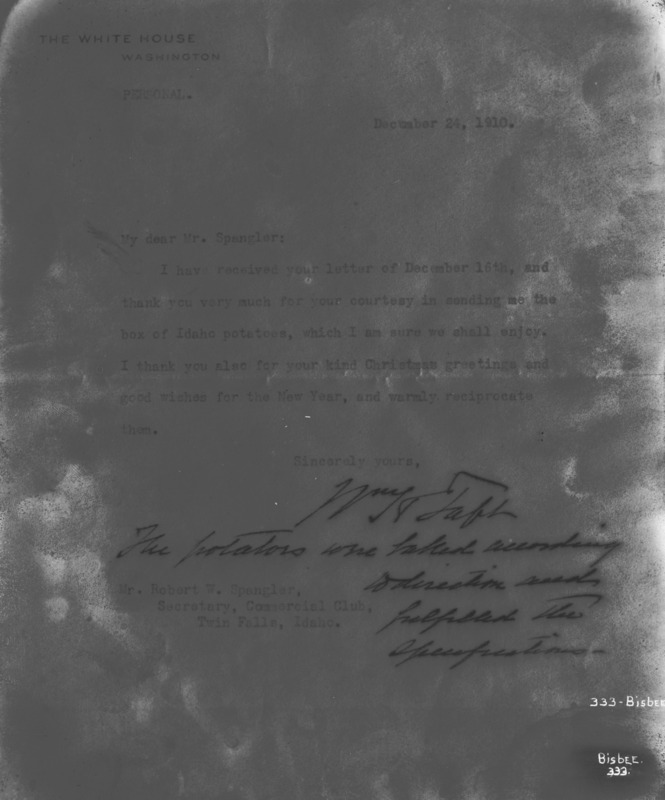 - A letter from President William H. Taft thanking the secretary of the Twin Falls Commercial Club, Robert W. Spangler, for a box of potatoes.