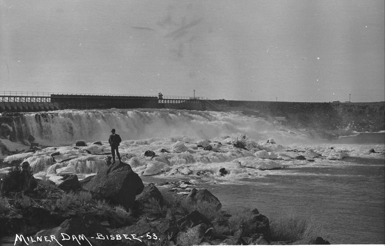 - "Milner Dam;" head gates; a man stands on a rock in the foreground. Ice covers some of the water.