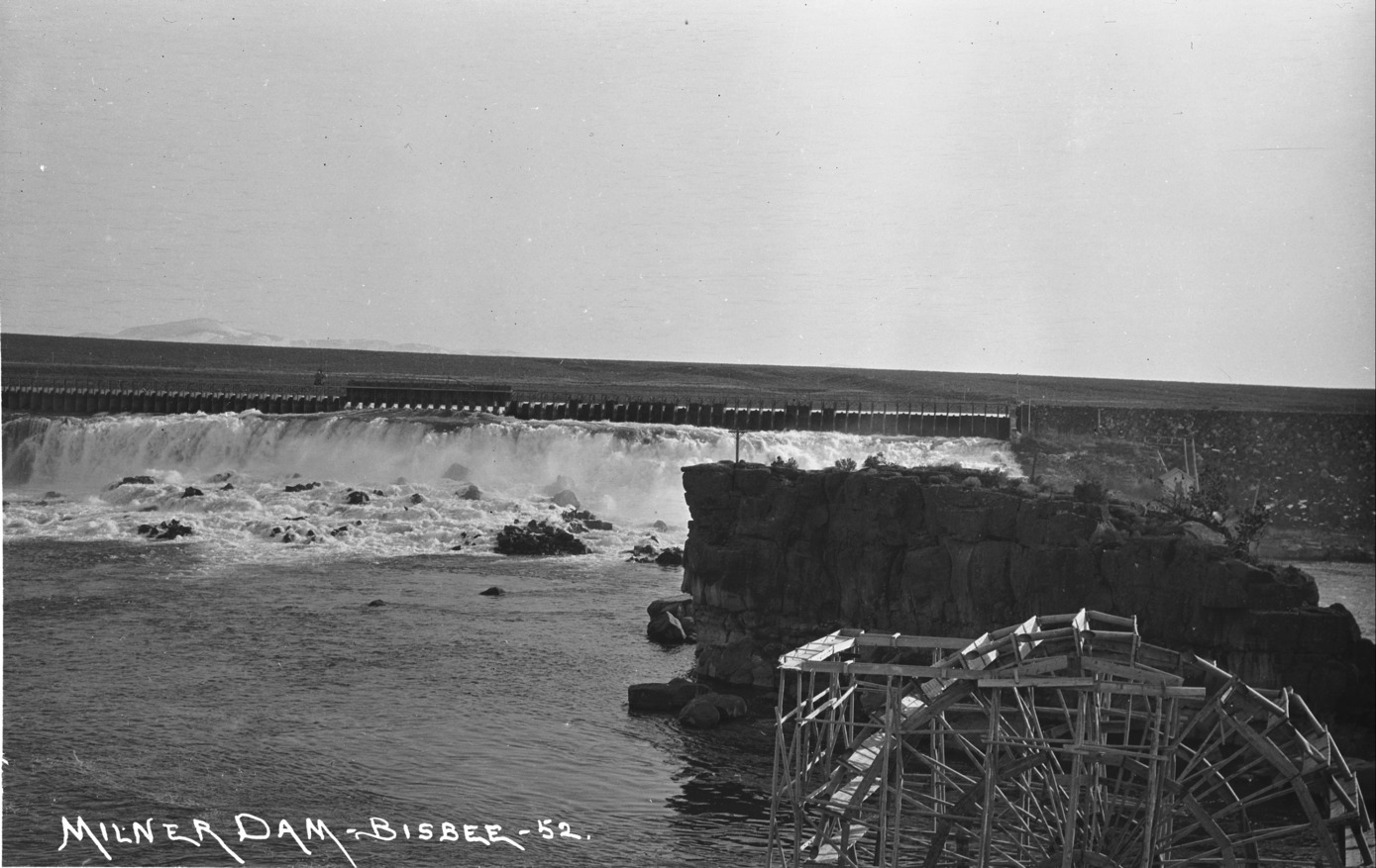 - "Milner Dam;" head gates; wooden water wheel in foreground.