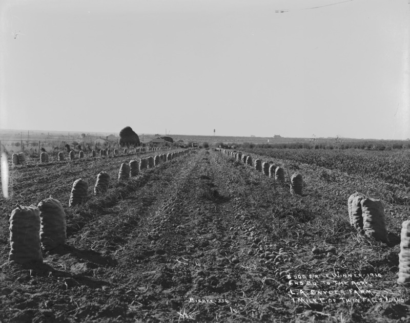 - "$500 prize winner - 1910. 645 bushels to the acre. L.A. Snyder farm, 1 mile east of Twin Falls, Idaho;" packed potato sacks standing in field