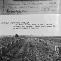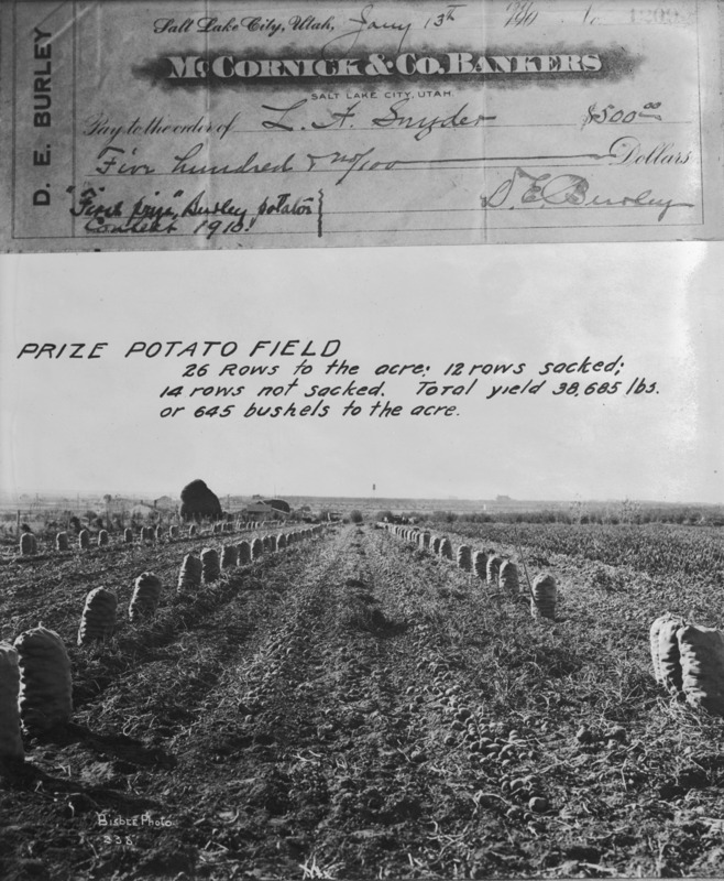 "Prize Potato Field; 26 rows to the acre; 12 rows sacked, 14 rows not sacked. Total yield 38,685 pounds or 645 bushels to the acre;" Copy of prize check written to L.A. Snyder in the amount of $500 with photo of field of potatoes, sacked and not sacked.