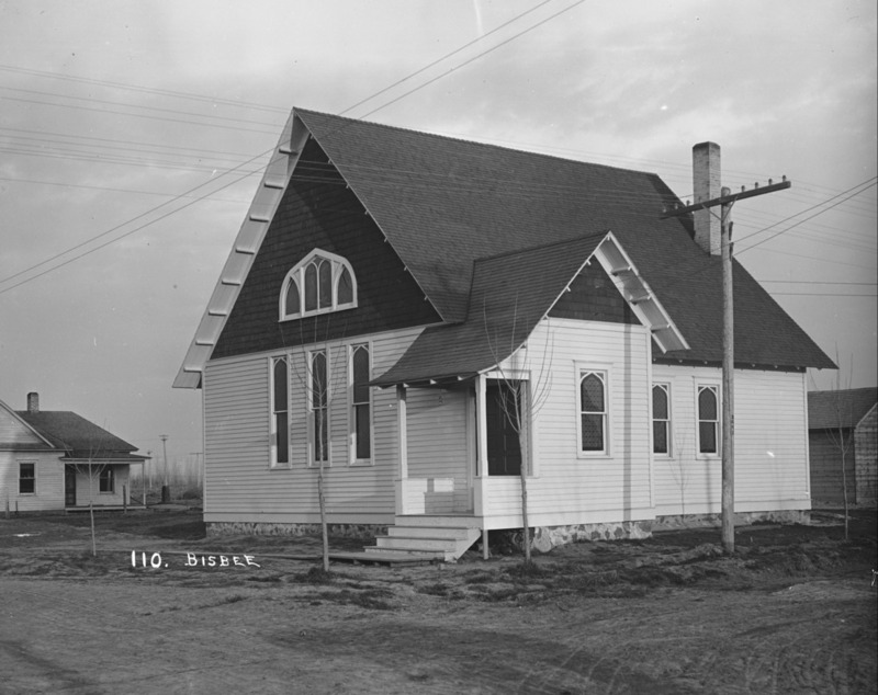 - Wood frame church; another house and outbuilding are visible.