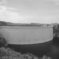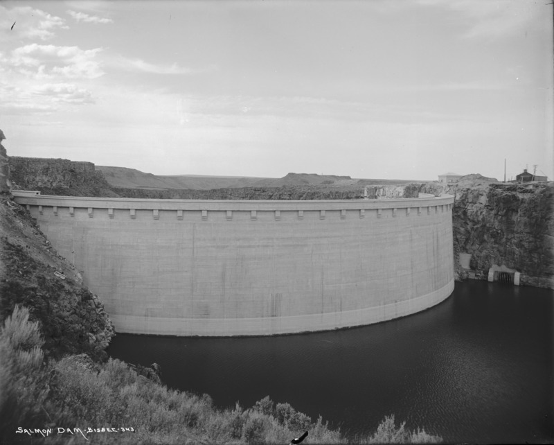 "Salmon Dam;" a look at the dam during construction, or shortly after completion in 1910. Buildings under construction on right.