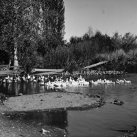 - Ducks float on a pond.