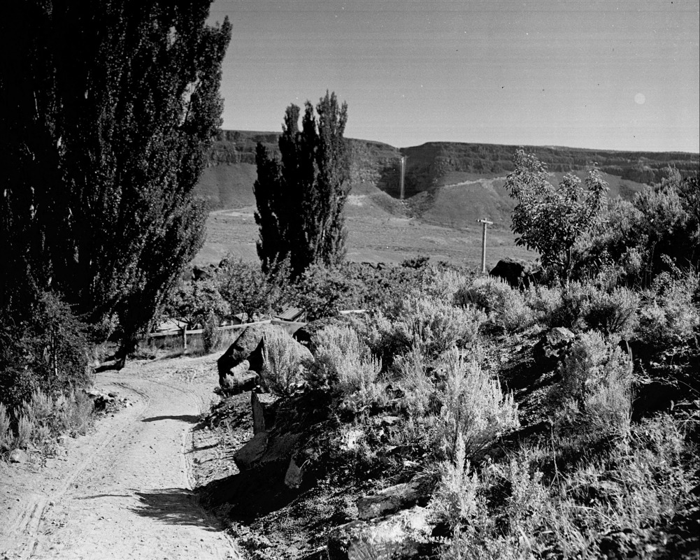 - A dirt road coming down the grade from the north side of the Snake River Canyon into the Perrine Ranch; Perrine Coulee waterfall visible on the opposite side of the canyon.