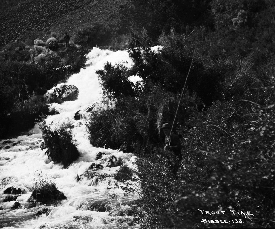 - "Trout Time;" a man stands amidst brush, fishing in a rushing spring