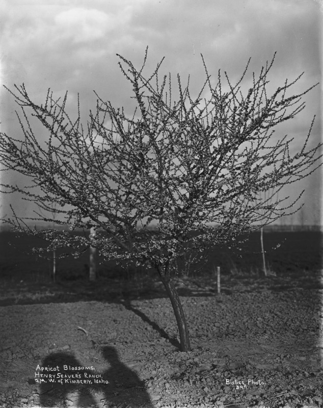 - "Apricot Blossoms, Henry Seaver's Ranch, 2 miles west of Kimberly, Idaho;" Apricot tree; Bisbee's shadow and that of his camera also in the photo.