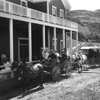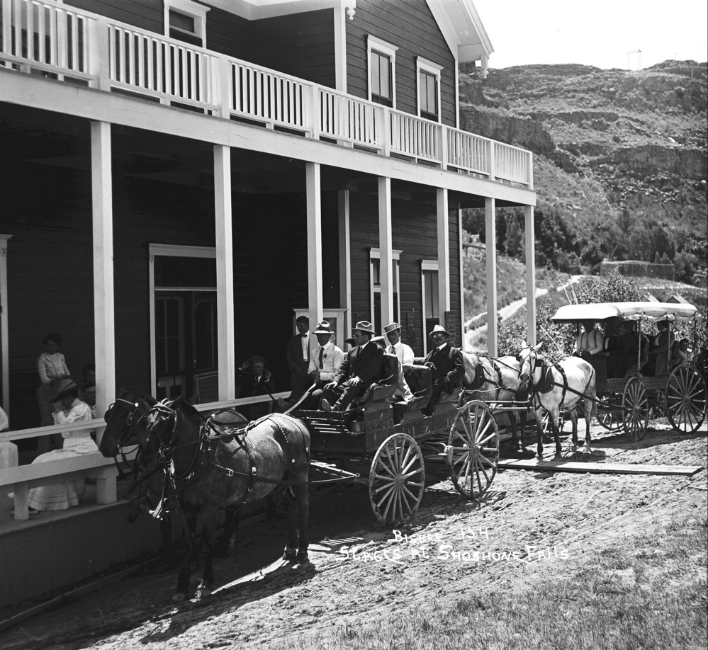 - "Stages at Shoshone Falls;" two teams of horses pull wagons (one covered) at the porch of the Hotel. Several people seated in wagons and on porch.