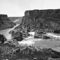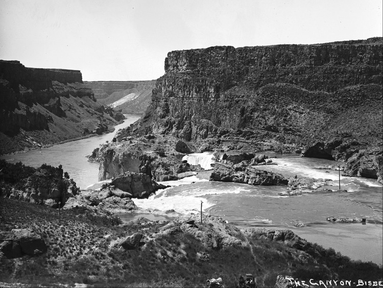 - "The Canyon;" view from the top of Shoshone Falls showing the canyon to the west. A covered wagon and a buggy are visible at the bottoem of the photo.