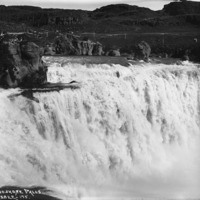 - "Shoshone Falls;" close-up view from the north side of the canyon, power lines and outbuildings can be seen on the south side.