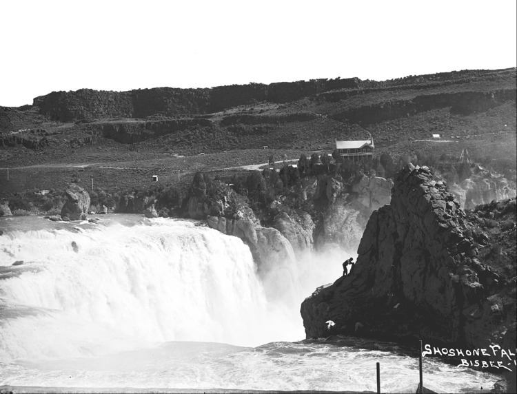 - "Shoshone Falls;" close-up view of the Falls, with a man climbing the rocks in foreground right. The Hotel, power lines, and outbuildings can be seen on the south side.