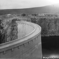 - "Salmon Dam;" view of the dam from the west canyon wall, with construction buildings on the far side.