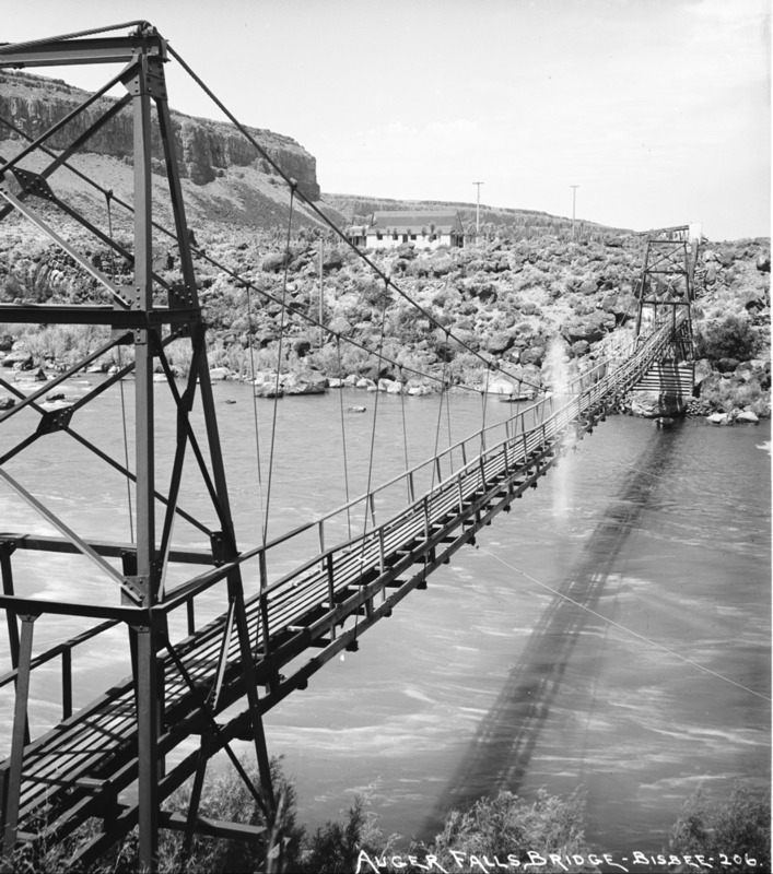 - "Auger Falls Bridge;" bridge across the Snake River in the Auger Falls area; house in background.