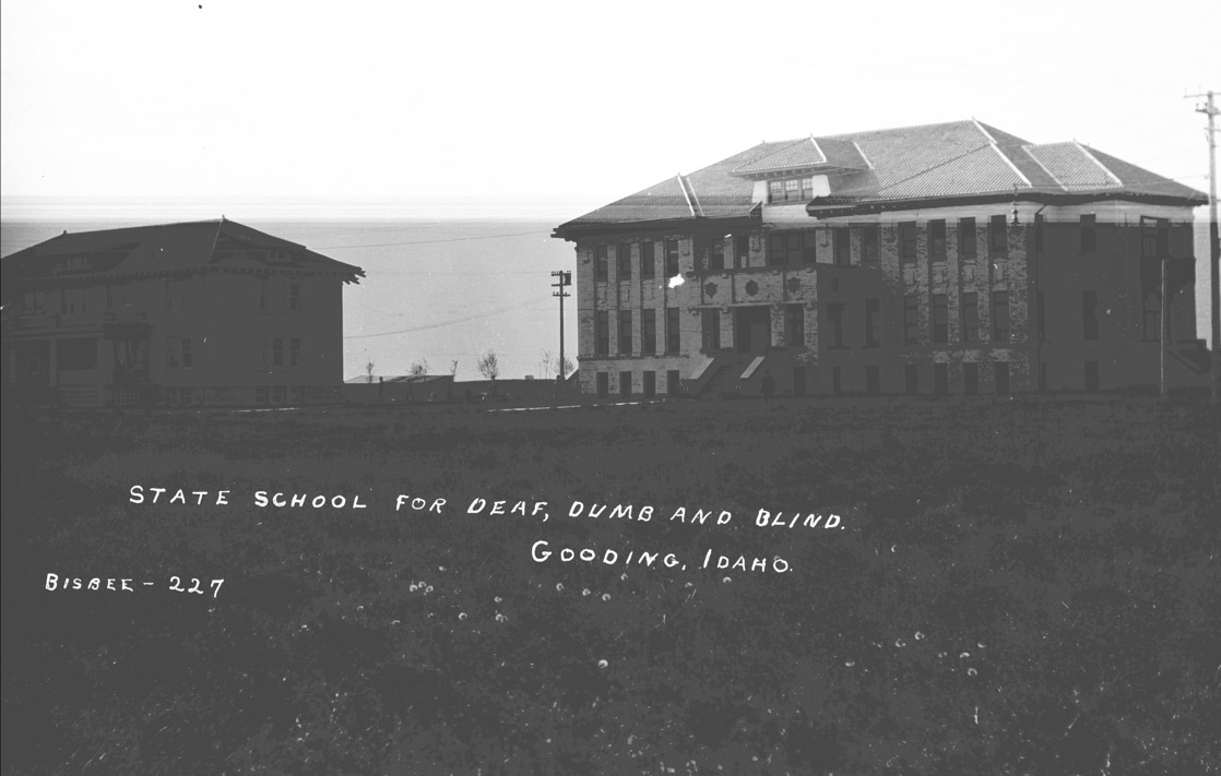 - "State School for Deaf, Dumb and Blind, Gooding, Idaho;" two large stone buildings viewed from across a field.