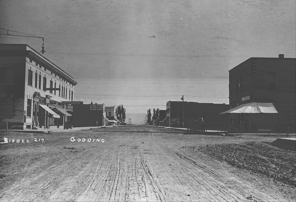 - "Gooding;" view down an intersection with several buildings. Businesses visible include: a bank; hardware store; dry goods; The Toggery, Gent's Furnishings, Clothing, Shoes; Light and Power; a hotel; and the U.S. Post Office.