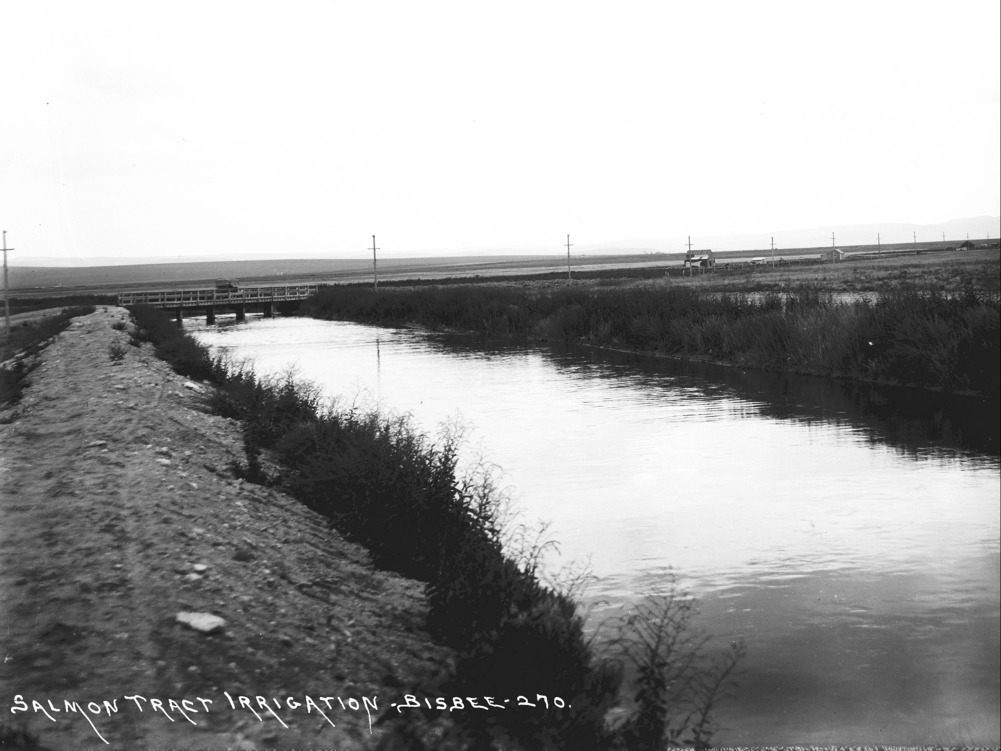 - "Salmon River Irrigation;" an automobile (car) traverses a bridge over a full canal; several buildings in background