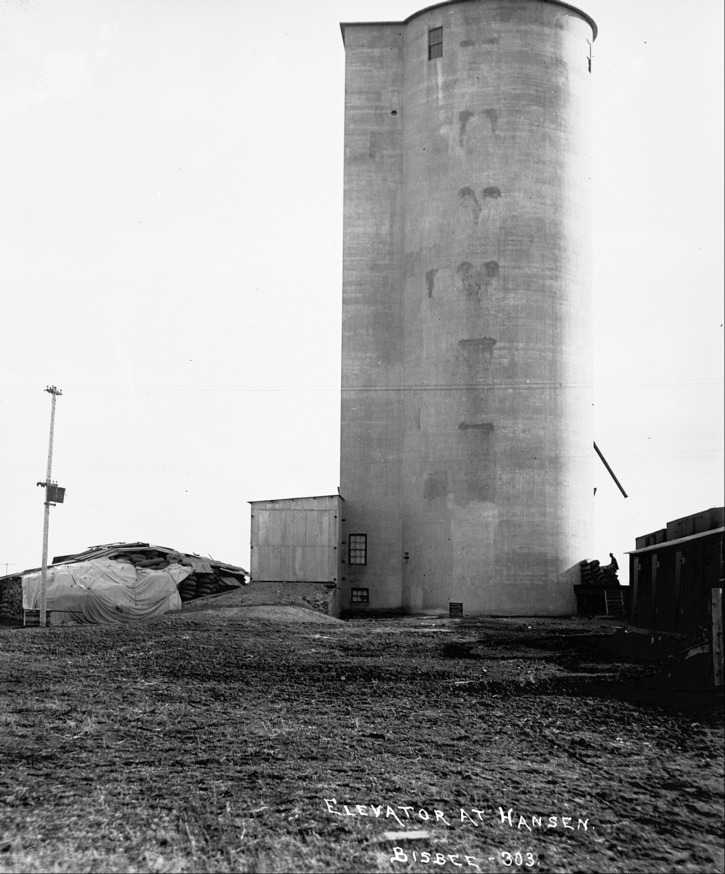- Elevator at Hansen; grain elevator; other outbuildings can be seen