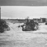 - "American Falls;" river-level view of the dam, channel and control house below the dam.