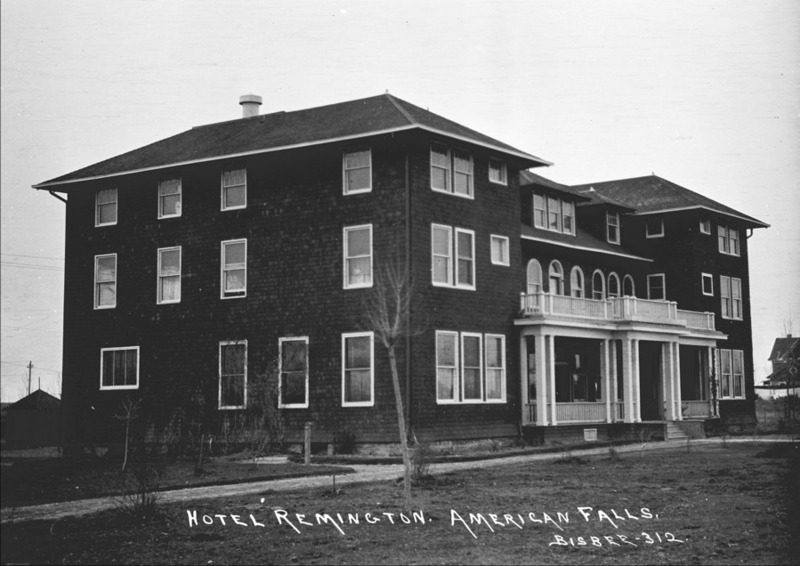 - "Hotel Remington. American Falls;"three-story brick hotel with a balcony over a colonnade front porch.