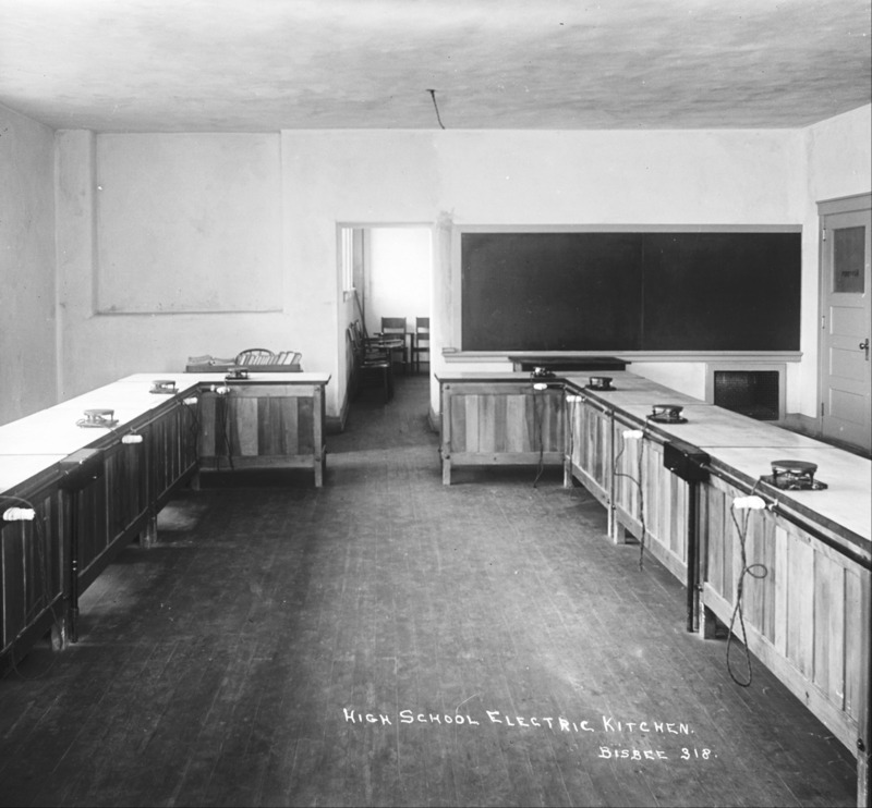 - "High School Electric Kitchen; a classroom with counters with elevated hot plates.