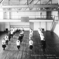 - "High School Gymnasium;" Twin Falls High School students in formation on the gymnasium floor, a couple sit on the floor in the back; staircase and mezzanine can be seen; basketball hoop and weights also visible
