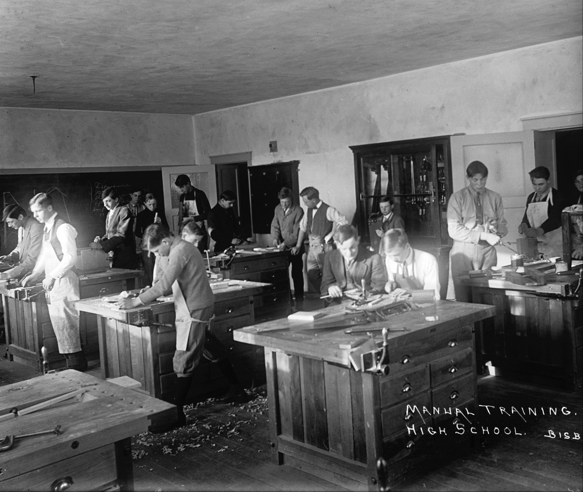 - "Manual Training. High School;" students working with saws, other carpentry tools in Twin Falls High School classroom.
